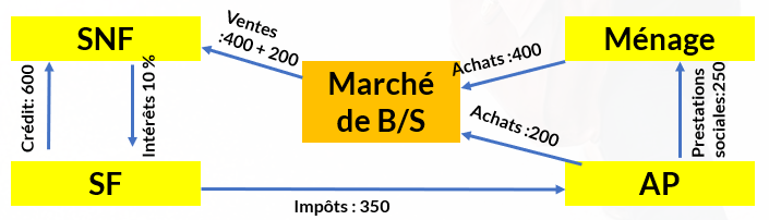 Exemple : Les E/ses ont vendu des B/S : 400 aux ménages et 200 aux AP. Les SF ont octroyé un crédit de 600 aux E/ses avec un taux d’intérêt de 10%. Les SF ont payé des impôts et taxes : 350. Les ménages ont bénéficié des prestations sociales d’une valeur de 250.