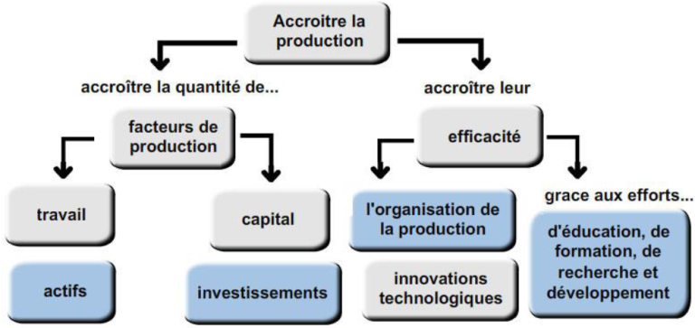- La croissance intensive : L’augmentation de la production provient principalement de l’efficacité productive (utilisation plus efficace des facteurs de production) facteur travail et facteur capital.