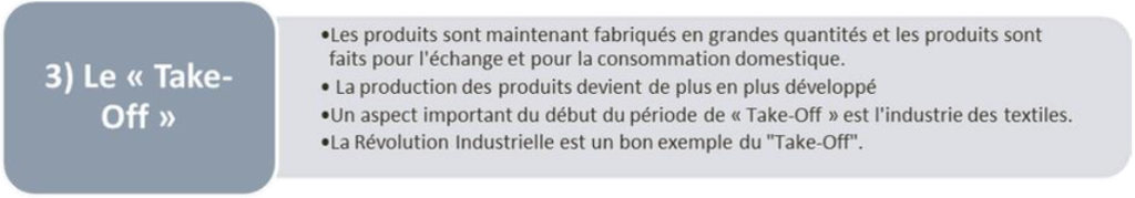 Le temps est facteur décisif dans le développement, Donc il propose les 5 étapes pour effectuer le décollage :